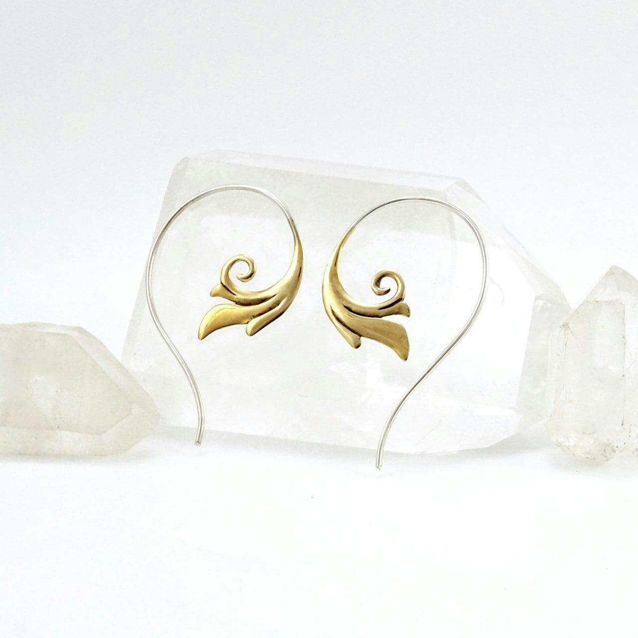 Adorn your ears with these serene curling spiral earrings. The body of each earring is solid brass, and is expertly soldered to sterling silver ear-wire. This light-weight, minimalist hoop is ultra-feminine and unique. Fun boho chic style for any occasion.