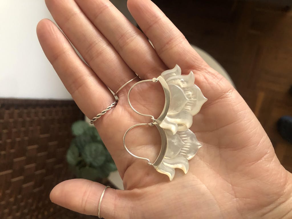 Ethically and sustainably harvested mother of pearl shell. These Lotus flowers are beautifully carved in Mother-of-pearl and set in a bezel. Both sides of each earring are carved with the same care and intricacy. Lightweight and gorgeous! Perfect for every occasion, from everyday wear to weddings!