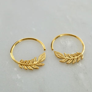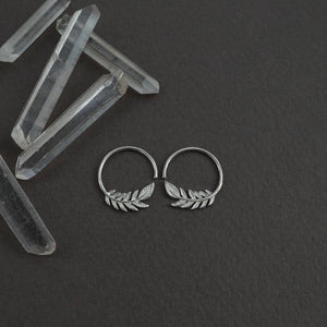 Delicate olive leaves cascade around a tiny sterling silver hoop — a quiet nod to peace and nature that works with everything, stacks beautifully, and feels like it was made to live in your ear. One pair.