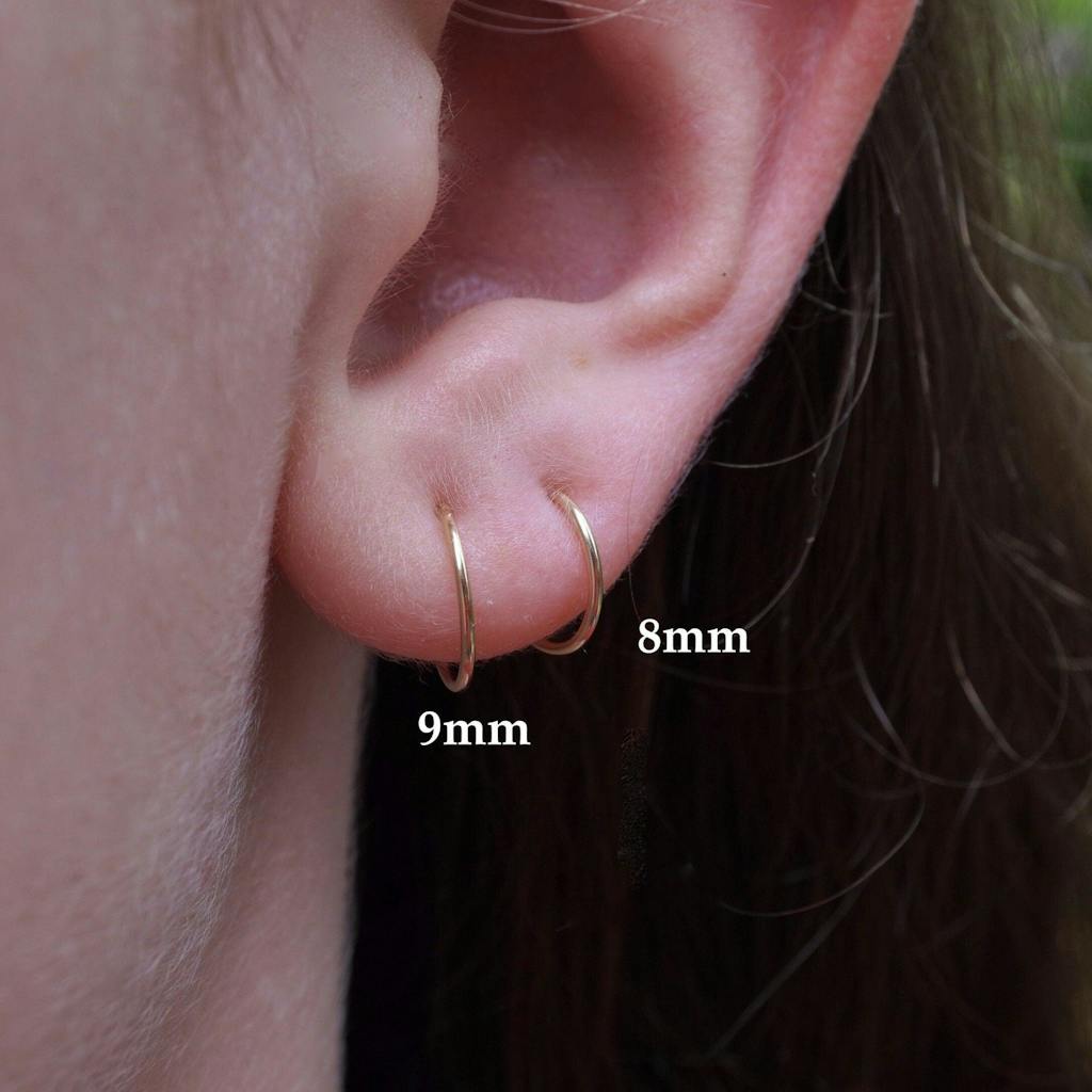 We measure these hoops by the inner diameter (from inner edge to inner edge). To help you get a better sense of sizing, the diameter of an of an un-used pencil eraser-head is equal to the inner diameter of our 7mm hoops. I suggest you grab a metric ruler, paper, and pencil to get a better idea of sizing. Please note, fit will also depend on your particular earlobes and location of piercings. If your ear is pierced high on the lobe and you have thicker earlobes, the hoops will fit more snuggly than if you have thin lobes and/or have piercings that are lower on the earlobes.