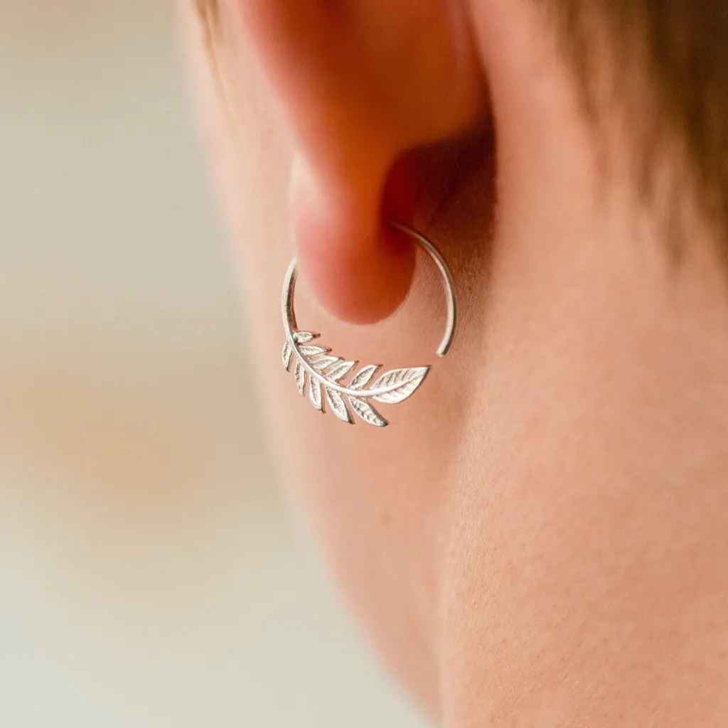 Delicate olive leaves cascade around a tiny sterling silver hoop — a quiet nod to peace and nature that works with everything, stacks beautifully, and feels like it was made to live in your ear. One pair.